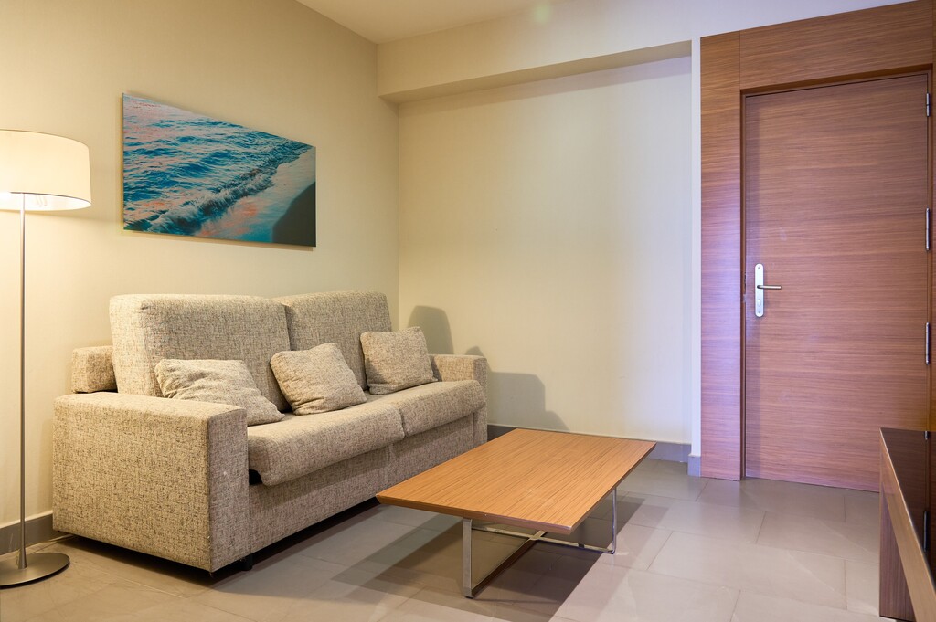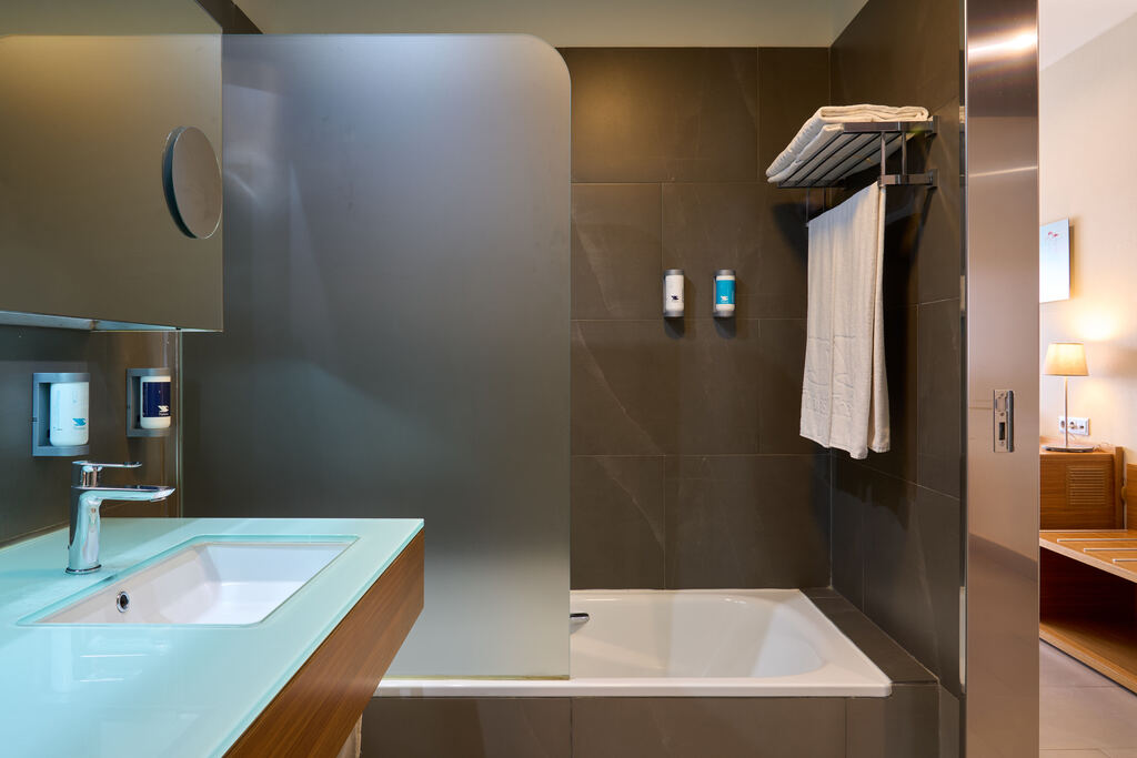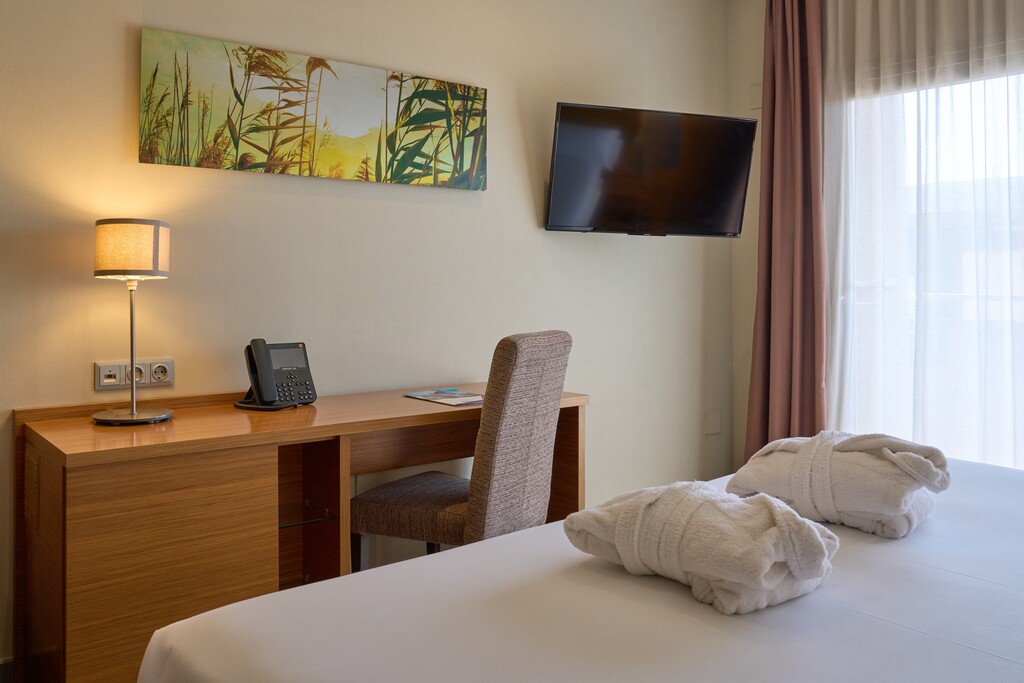 Habitación compuesta de dos estancias y con terraza exterior orientada al centro de talasoterapia. El dormitorio dispone de una cama de 200cm x 200cm. A la entrada hay un salón equipado con sofá y televisión. Cuarto de baño completo con bañera. El minibar incluye agua de cortesía. Ideal para descansar tras un día de relax en las piscinas termales.